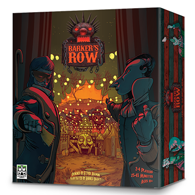 Barker's Row is a 2-4 player game in which you are a carnival barker trying to fill your 3D chipboard seats with "rube" meeples by playing the most fantastic Attractions. You draft Barker Cards from a community pool and play them into the Midway. Then you use those cards to play one of ~50 Attractions that will amaze and delight the rube meeples in your seats while giving you a special power to use later in the game.
