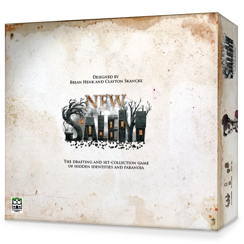 New Salem is a card-based hidden identity, deduction, drafting, and set collection game for 3-8 players that relies on simultaneous play to provide an extremely engaging social experience in under 30 minutes. Each player receives a character card that determines the building types they will attempt to collect. Puritans must also pool their resources (hope) to prevent New Salem from being overrun with despair.