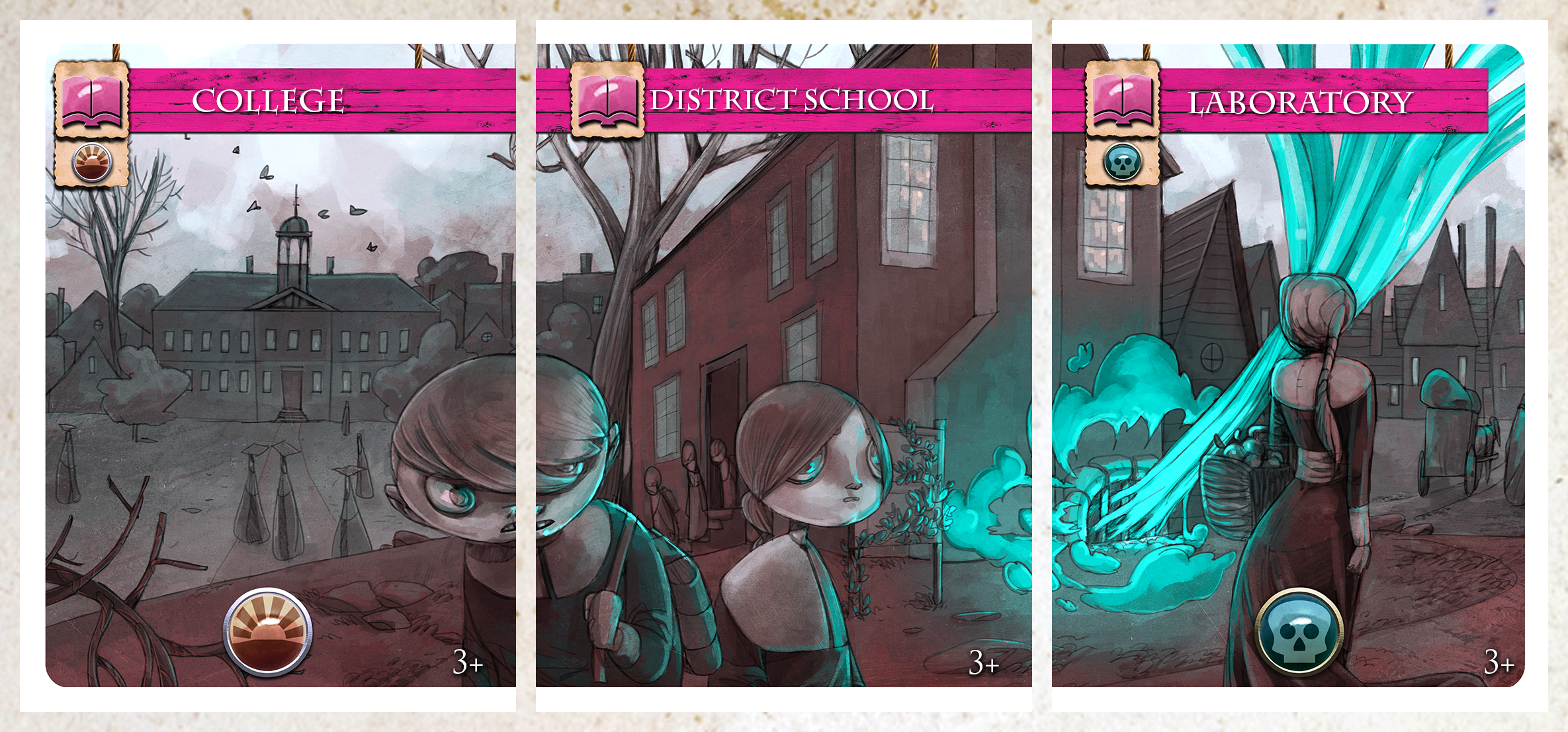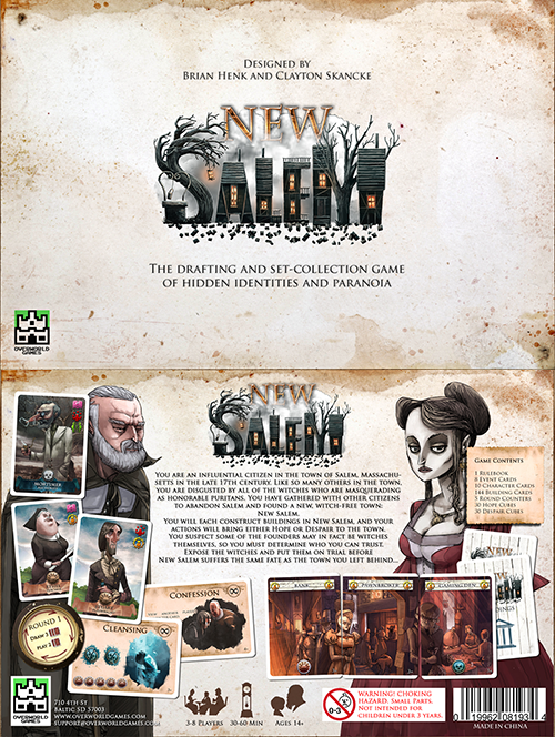 You and several of your fellow 17th century citizens have decided to flee Salem, Massachusetts in the midst of the famous Salem Witch Trials to create an opportunity to start anew. You are all committed to eliminating any witch presence in your new town, but you also have your own selfish priorities for how development should be directed. Work to build the new town you envision while keeping New Salem free of the Despair wrought by witches. Don't forget you can pimp out your box insert for New Salem at GameTrayz.com.